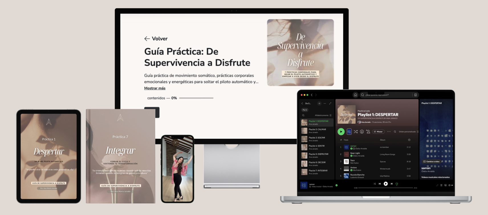 Video · Audio guiado · PDF journaling · Playlist Spotify — en cada práctica